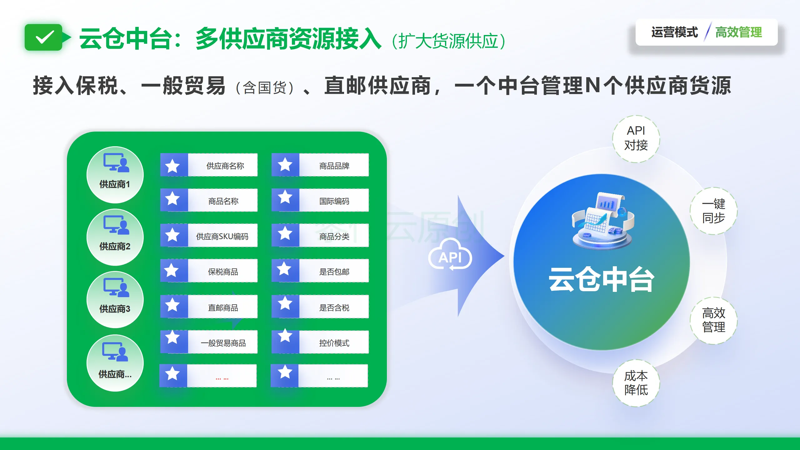 云仓中台可整合上游多类型供应商资源与下游全渠道销售网络,打通保税仓(保税备货模式)、海外仓(海外直邮模式)、国内仓(完税模式)等全域仓储节点,构建“上游供应商+中台+下游销售渠道”的无缝衔接体系,实现业务流、商品流、订单流、资金流的高效协同、流转。(例如,我司自营的云仓中台,早已对接国内主流保税仓供应链入驻,涵盖美妆护肤、保健品、酒水、母婴等热门产品。)